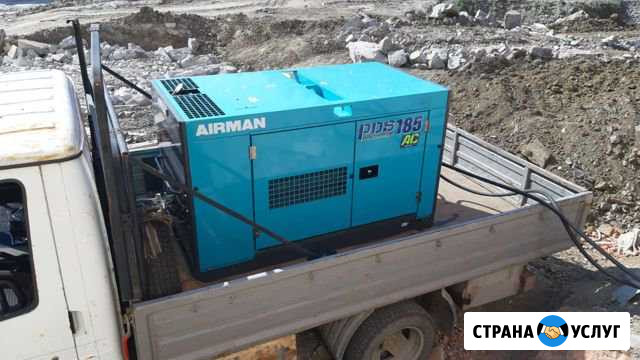 Предлагаем в аренду НОВЫЙ компрессор Airman 185 с осушителем, с 2, 3, 4 отбойными молотками. На базе ГАЗели. Длина шлангов 50 м. Производительность 5м3/мин. Давление 7 атм. Компрессор предназначен для проведения различных работ: продувка, опрессовка, пескоструй, рубка свай, демонтаж бетона. Нал/бнал. 600 - 2 молотка, 800 - 3 молотка, 1100 - 4 молотка, 900 - продувка за наличный расчет, 700 - 2 молотка, 900 - 3 молотка, 1200 - 4 молотка, 1000 - продувка - без НДС